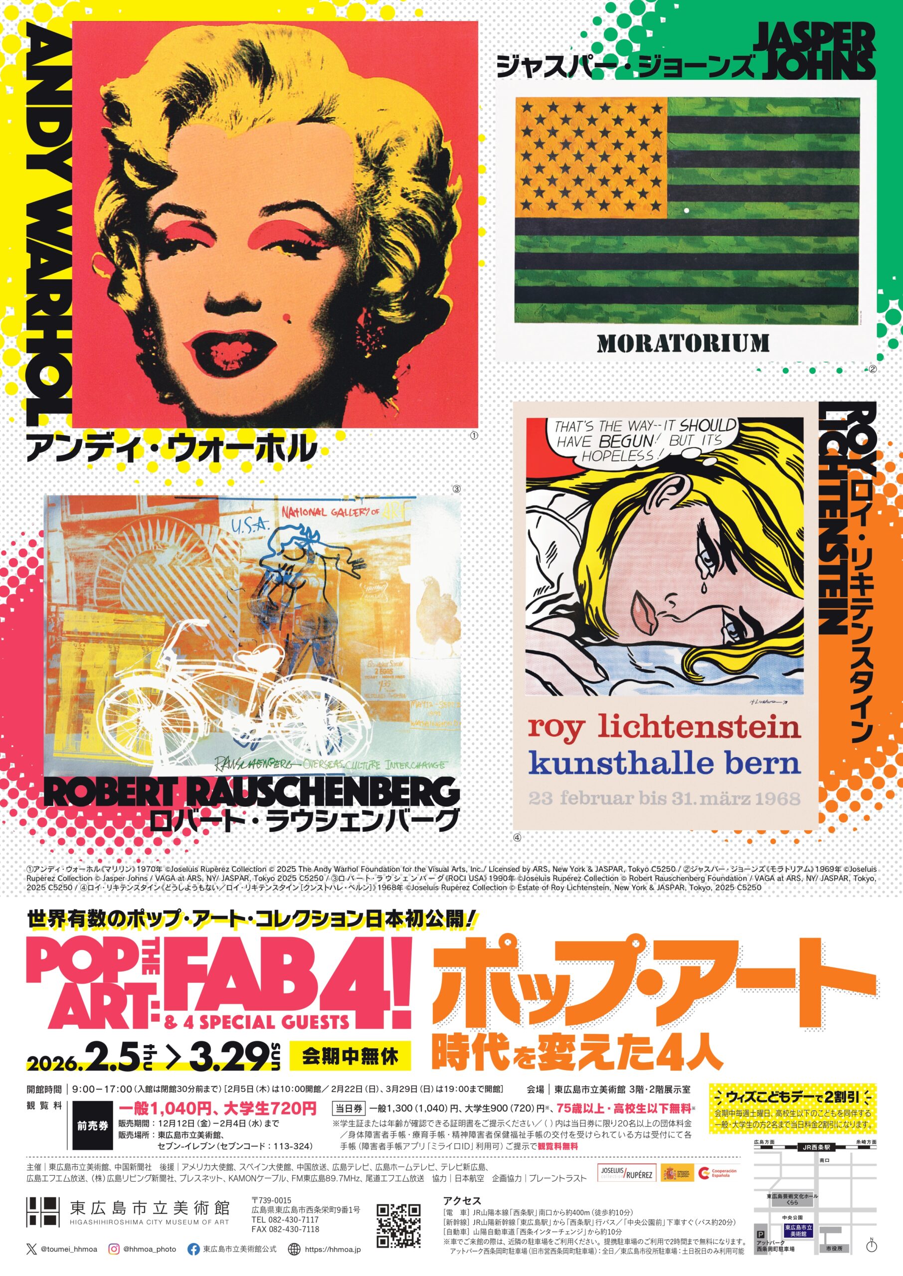本展では、同時代に脚光を浴びたイギリスのポップバンド、ザ・ビートルズの愛称「ザ・ファビュラス・フォー(FAB 4=素晴らしき4人)」になぞらえ、アメリカを代表するポップ・アートの作家、ロイ・リキテンスタイン(1923-1997)、アンディ・ウォーホル(1928-1987)、ロバート・ラウシェンバーグ(1925-2008)、ジャスパー・ジョーンズ(1930-)の4名に焦点をあてます。さらに、同時代に活躍したロバート・インディアナ、ジェームズ・ローゼンクイスト、トム・ウェッセルマン、ジム・ダインもあわせてご紹介します。彼らは戦争や社会問題が巻き起こっていた激動の時代において、大衆文化やロック音楽との関わりを通じてアートと社会の姿を変えていきました。